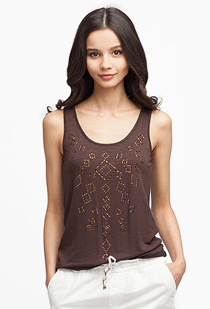 Топ изготовлен из тонкого вискозного трикотажа. Окантовка по горловине и проймам. Спереди термо аппликация металлическими стразами цвета меди.