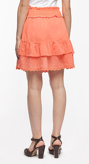 Юбка женская выполнена из тонкой марлевой ткани с лёгким эффектом крэш, на хлопковой подкладке. На талии широкий пояс, простроченный резиновой ниткой, которая собирает пояс в сборку. По низу воланов кружево с фигурным краем.