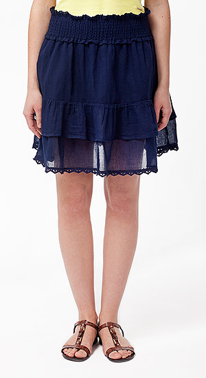 Юбка женская выполнена из тонкой марлевой ткани с лёгким эффектом крэш, на хлопковой подкладке. На талии широкий пояс, простроченный резиновой ниткой, которая собирает пояс в сборку. По низу воланов кружево с фигурным краем.