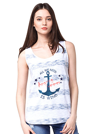 Топ выполнен из хлопкового трикотажного полосатого полотна, принт нанесен с изнаночной стороны так, что на лицевой стороне создает оригинальный эффект. Спереди принт "Якорь". Проймы и горловина обработаны бейками. От проймы до низа проходят декоративные швы.