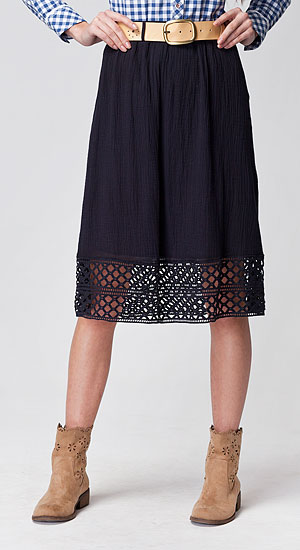 Юбка из тонкой фактурной ткани с лёгким эффектом крэш - марлёвки. Пояс прострочен тремя параллельными эластичными строчками. В верхний край вставлена резинка для лучшей фиксации на талии. Спереди и сзади по 2 шлевки. По низу юбки настрочено широкое кружево, имитирующее вязку крючком. Юбка имеет тонкую хлопковую марлевую подкладку.