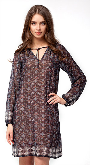 Платье свободного силуэта из принтованной ткани в винтажном стиле на трикотажной бежевой подкладке. Глубокий V-образный вырез на завязках. Свободные рукава присборены на манжетах.