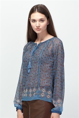 Воздушная блузка свободного силуэта из принтованной ткани в винтажном стиле. На спине сборки от горловины, V-образный вырез с планкой на шнуровке. Шнурок продет через металлические люверсы. Горловина, планка и манжеты отделаны искусственной замшей.