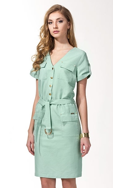Платье из натуральных волокон льна и хлопка. Полуприлегающий силуэт обеспечивает пояс и резинка на талии. Накладные карманы с клапанами на груди и бедрах. Углы клапанов украшены золотистыми заклепками, на левом кармане лого. Полочки застегиваются на золотистые кнопки. Пояс фиксируется сзади широкой шлевкой, закрепленной заклепкой. По спинке от кокетки - бантовая складка. Рукав с отложной манжетой. Длина рукава регулируется застёжкой на пату.