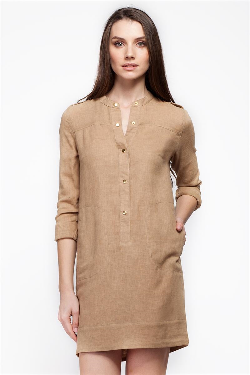 Платье из фактурной тонкой хлопковой ткани "под лен". Спереди и сзади кокетка, с отстрочками толстой ниткой. Воротник стойка, застежка, погоны и манжеты на золотых кнопках, боковые карманы с декоративной отстрочкой. Рукава регулируются при помощи отворота и застежки на пату.