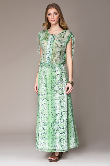 Платье выполнено тонкой марлевой ткани на подкладке. Спереди застежка на планки с навесными петлями и контрастными пуговицами. На плечах кулиса с пояском, с помощью которого регулируется длина плеча и количество сборки. Пройма заканчивается отложной манжетой. В талию втачан пояс на сборке, простроченный эластичными нитями.