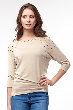 Тонкий джемпер с цельнокроенным рукавом "летучая мышь". Свободный силуэт с заужением к низу. Горловина и проймы украшены клеевыми заклепками цвета состаренное золото.