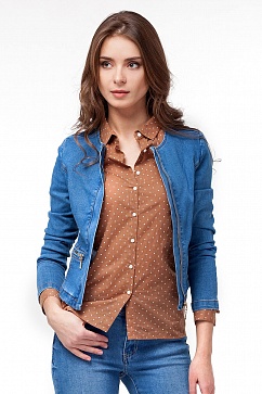 Жакет джинсовый выполнен из очень эластичного полотна. Без воротника с потайной застежкой на золотистой молнии. Внутренняя часть кокетки спинки выполнена из отделочного материала - тонкого хлопка с декоративным узором. Горизонтальные карманы спереди с застежкой молнией.
