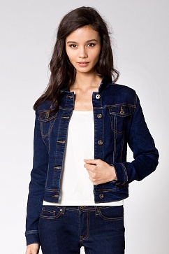 Джинсовый жакет классического покроя. На груди карманы с клапанами, на талии - прорезные с листочкой. Декоративные контрастные строчки выполнены толстыми нитками. Минимальная стирка с отсутствием потери цвета - актуальное исполнение в стиле 70-х.