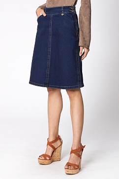 Джинсовая юбка-трапеция на широком поясе. Косые карманы спереди, застежка на пуговицы и молнию в боковом шве. Контрастные отделочные строчки выполнены толстыми нитками. Минимальный эффект стирки в стиле 70-х.