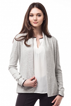Жакет выполнен из тонкой вискозной пряжи. Спереди широкие планки переходящие в ворот-шаль. По низу рукавов манжет связанный эластичной резинкой.