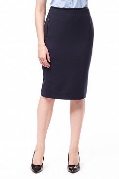 Юбка-карандаш выполнена из мягкой, эластичной костюмной ткани в фактурную черно-синюю "лапку". Пояс и декоративные элементы, имитирующие карманы, окантованы мягкой искусственной кожей. В больших размерах длина юбки увеличивается на 2см.