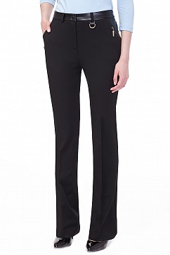 Классические брюки-клеш со стрелкой изготовлены из плотной эластичной костюмной ткани. Спереди прорезные карманы на молнии. Пояс и декоративные вставки над карманами из черной искусственной кожи.
