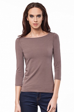 Базовая плотно прилегающая женская футболка. Вырез - лодочка, рукава 3/4. Низ изделия украшен золотистым логотипом.