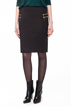 Юбка из эластичной костюмной ткани с благородным матовым блеском. По бокам декоративные золотые молнии с подвесками. Верхняя молния - обманка, нижняя молния - застежка кармана. Юбка без пояса, на внутренней обтачке, подкладке из полиэстера. Сзади застежка на молнию с подзором. В больших размерах длина платья за колено.