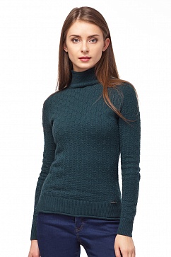 Свитер узорной вязки из теплой и пушистой пряжи. Ворот-стойка, манжеты, и низ свитера связаны резинкой.