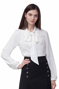 Блузка выполнена из креповой полу вискозной ткани. Горловина обработана воротником-шарфом, который может завязываться спереди бантом, или на узел. Рукава втачные, широкие, с защипами у плеч, внизу собираются на узкую манжету.