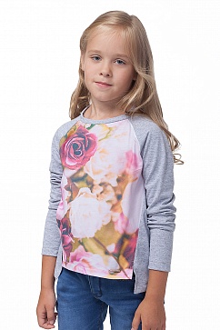 Футболка из хлопкового полотна. Удлиненная спинка, передняя часть изделия из принтованного полотна. Боковые швы смещены вперед, по низу швов разрезы. Низ переда декорирован металлической нашивкой золотого цвета с логотипом.