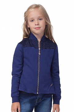 Жакет в спортивном стиле из футера на молнии с декоративной подвеской. Воротник стойка. Кокетка декорирована кружевом в тон изделия. Оригинальный крой жакета с расклешением к низу и баской. Спереди металлическая нашивка с логотипом.