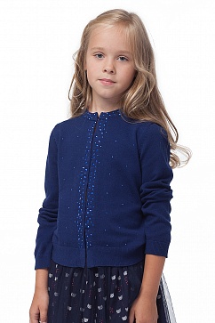 Вязанный жакет из тонкой пряжи с застежкой на крючки. Перед изделия и окантовка горловины украшены декоративными металлическими стразами.