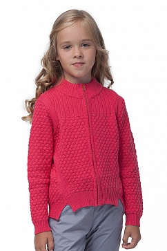 Жакет оригинальной ажурной вязки на молнии. Удлиненная спинка изделия со смещенными вперед боковыми швами.