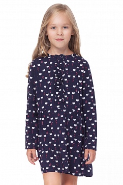 Платье для девочки свободного силуэта из принтованной вискозной ткани. Отрезное по линии талии, под талией небольшая сборка. Перед декорирован вертикальной оборкой из основной ткани. Застежка сзади на молнию.
