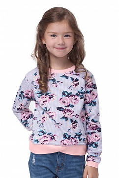 Джемпер из принтованного футера. Сзади вырез капля с завязкой на бант. Низ изделия, горловина и манжеты на контрастной резинке.