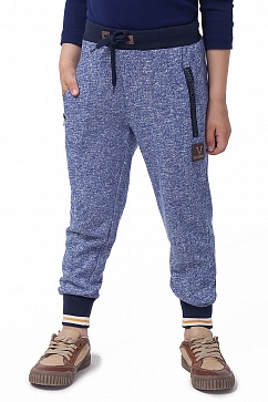 Брюки для мальчика из двухниточного футера. Пояс и манжеты по низу изделия выполнены из рибаны. Пояс на резинке. Боковые карманы на молнии. Под карманом декоративная нашивка из искусственной кожи.