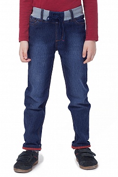 Джинсы классического силуэта с контрастной окантовкой подгибки низа. Пояс на рибане с резинкой. Изделие декорировано потертостями и отделочными строчками контрастного цвета.