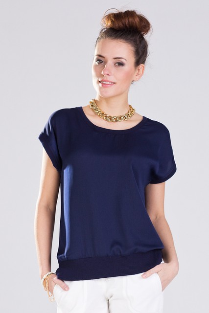 Блуза выполнена из тонкого синтетического шелка с матовой поверхностью. Горловина, рукава заканчиваются трикотажным манжетам, оригинальной вязки. По низу изделия вязаная рибана.