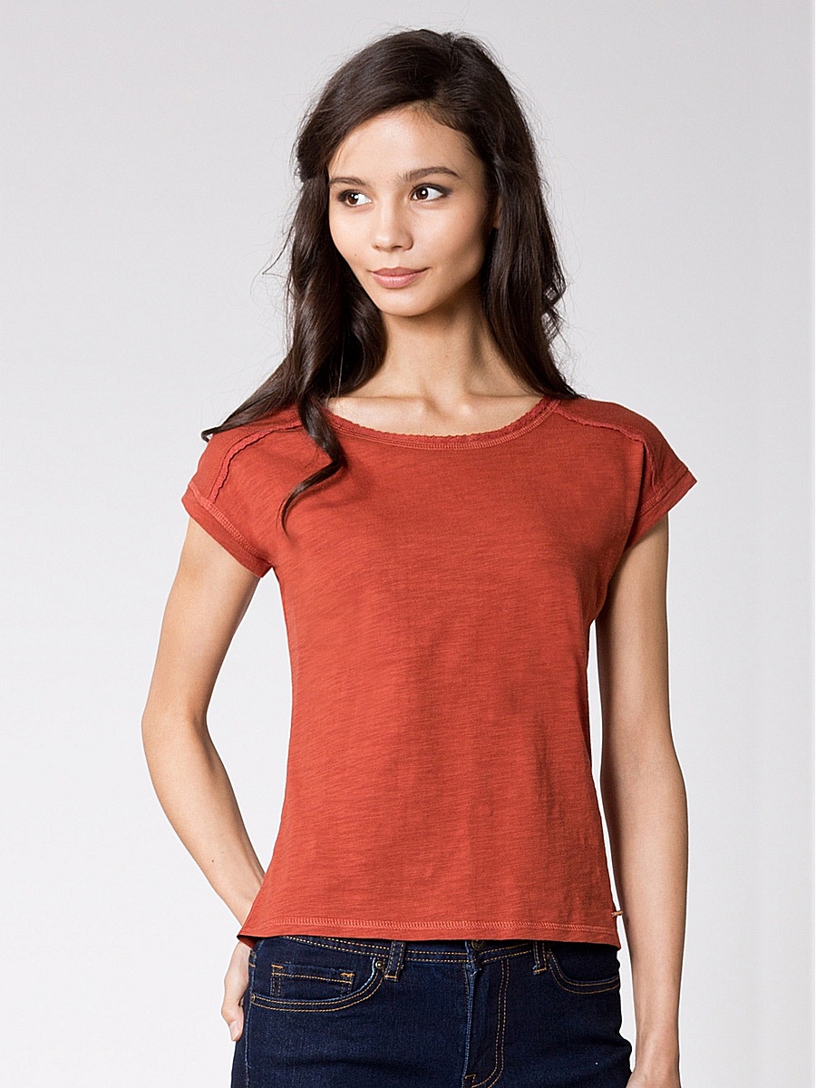 Футболка женская из трикотажного фактурного хлопкового полотна с декоративными швами на плечах, которые, как и горловина, украшены кружевом в тон футболки. Спущенное плечо, объемный верх хорошо сочетается с узким низом. Внизу пришит маленький золотистый логотип.