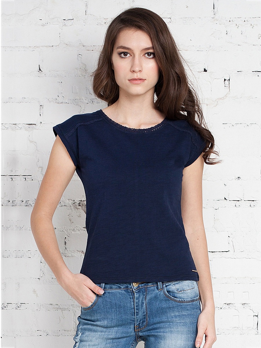 Футболка женская из трикотажного фактурного хлопкового полотна с декоративными швами на плечах, которые, как и горловина, украшены кружевом в тон футболки. Спущенное плечо, объемный верх хорошо сочетается с узким низом. Внизу пришит маленький золотистый логотип.