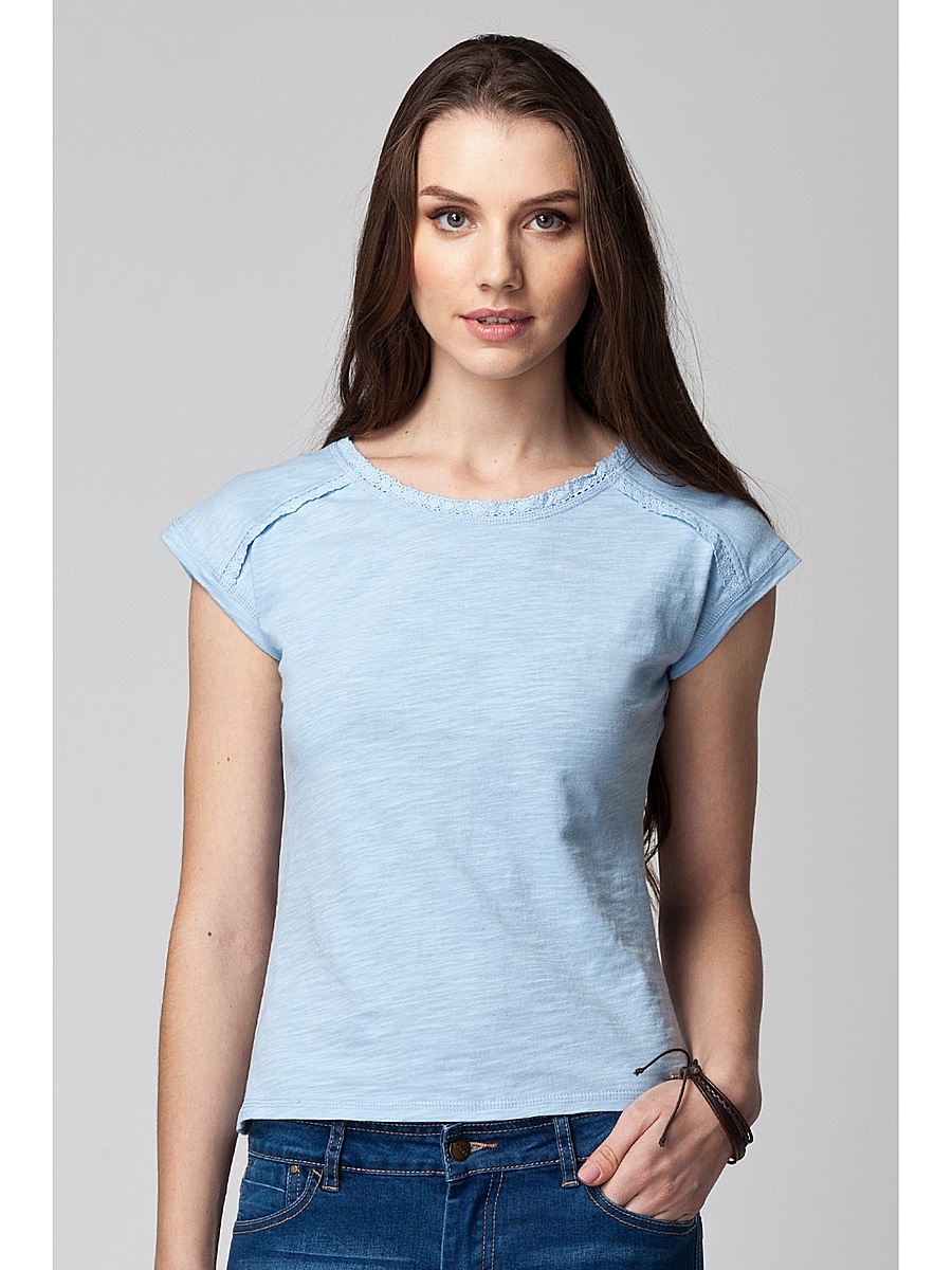 Футболка женская из трикотажного фактурного хлопкового полотна с декоративными швами на плечах, которые, как и горловина, украшены хлопковым кружевом в тон футболки. Спущенное плечо, объемный верх хорошо сочетается с узким низом. Внизу пришит маленький золотистый логотип.