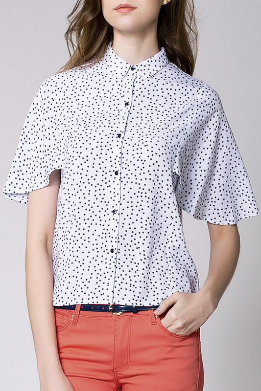 Блузка изготовлена из штапельного вискозного полотна с принтованным рисунком. Рукава выполнены в виде удлиненного крыла. Пластиковые пуговицы.