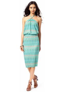 Платье на подкладке выполнено из ажурного трикотажа с вкраплением люрекса. Спереди платье собрано на декоративное золотистое кольцо, к которому прикреплены завязки. Пояс и спинка изделия на резинке. В больших размерах длина увеличивается и закрывает колено.