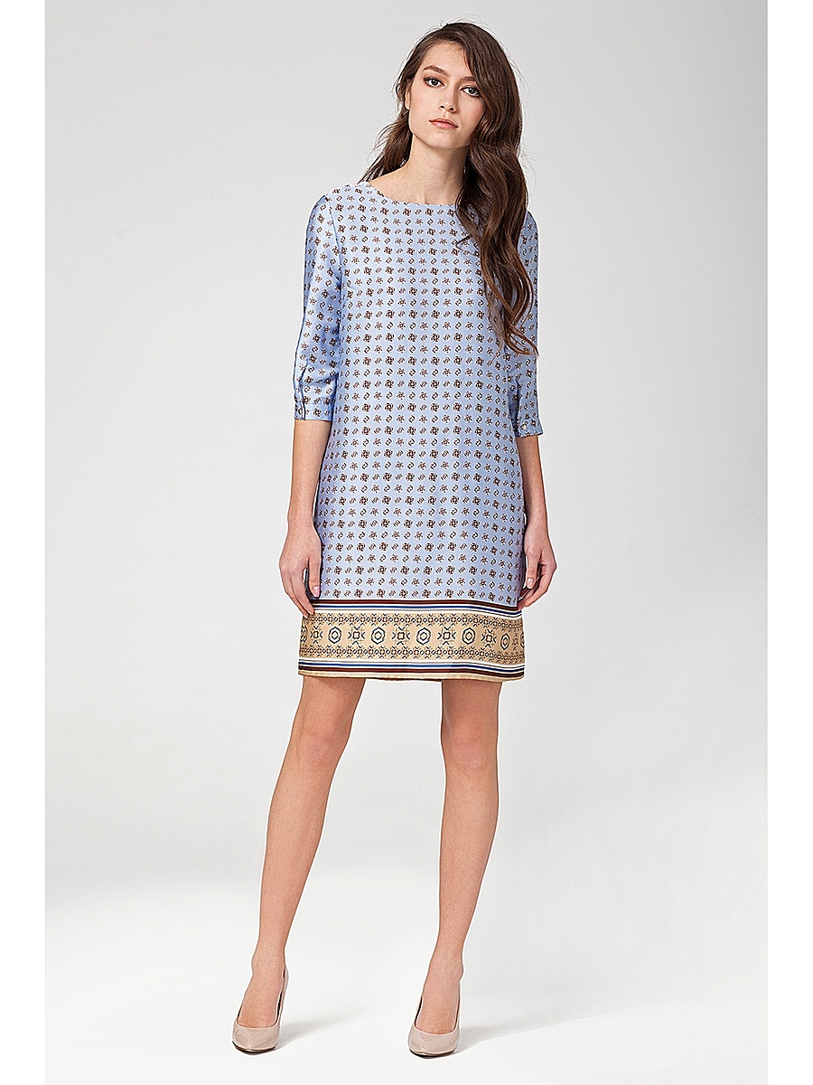 Платье прямого силуэта с купонным рисунком по низу. Вырез фигурный сзади с перемычками. Рукав 3/4 с манжетой , застегивающейся на пуговицу. Платье на бежевой трикотажной подкладке. В больших размерах длина до колена.