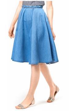 Юбка из плотной мягкой джинсы, покрой - солнце. Пояс декорирован сплетенной из джинсовых полосок косичкой. Застежка на металлическую молнию.