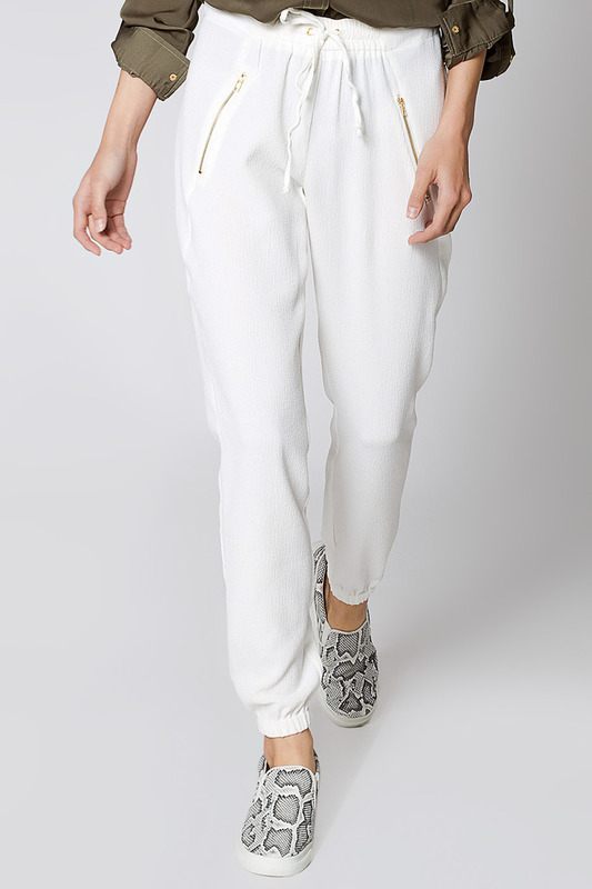 Брюки изготовлены из тонкого пластичного крепового полотна. Центральная часть переднего пояса и задняя часть пояса собраны на резинку. Спереди металлические люверсы, из которых выходит тонкий пояс-веревочка с узелками на концах. Спереди наклонные швы с декоративной металлической молнией золотистого цвета. Внизу штанины собраны на резинку.