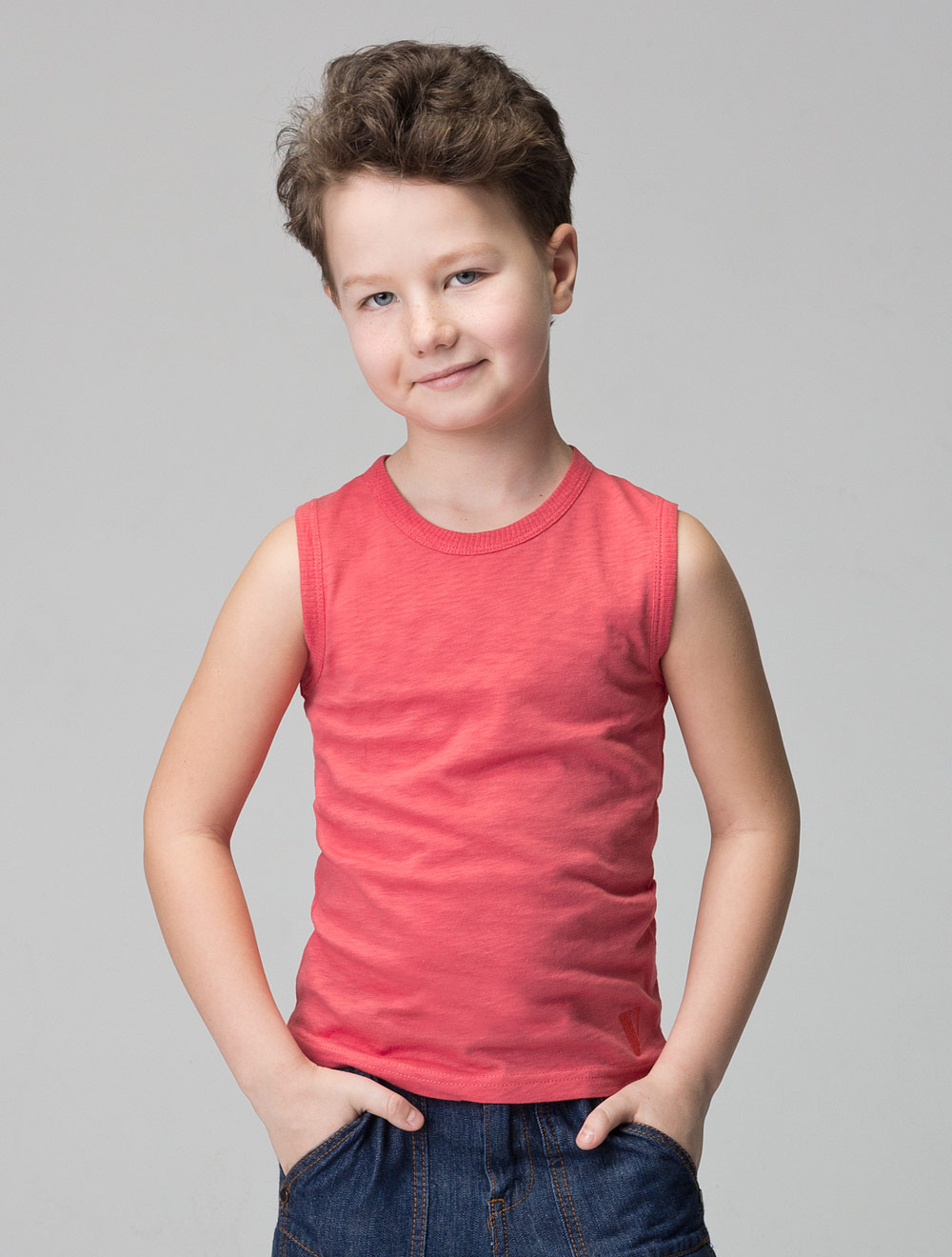 Описание: Майка из фактурного хлопкового трикотажа с уплотнением нити в переплетении. В нижнем углу изделия небольшая вышивка буква V в тон изделия.