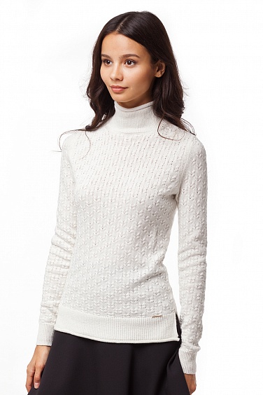 Свитер узорной вязки из теплой и пушистой пряжи. Ворот-стойка, манжеты, и низ свитера связаны резинкой.