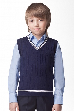 Джемпер-обманка, что позволяет быстро надевать изделие. Жилет связан из хлопковой пряжи, что придает особую комфортность при носке. Рукава и воротник выполнены из сорочечной ткани.