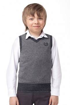 Вязаный жилет из мягкой пряжи. Низ изделия и манжеты рукавов выполнены из меланжевой пряжи. На груди вышивка. Спинка из пряжи контрастного цвета.