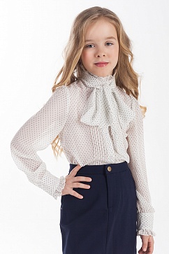 Блузка из непрозрачного шифона с галстуком-бантом. Воротник-стойка и края манжет рукавов декорированы небольшой оборкой. Перед украшен декоративной строчкой.