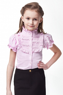 Блузка из трикотажа. Кокетка и воротник выполнены из блузочной ткани. Кокетка, воротник-стойка и рукава декорированы оборкой.