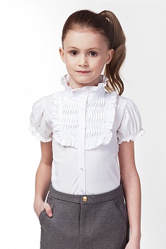 Блузка из трикотажа. Кокетка и воротник выполнены из блузочной ткани. Кокетка, воротник-стойка и рукава декорированы оборкой.
