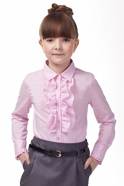 Блузка с жабо и узкой оборкой по краю манжет рукавов.