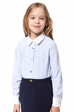Блузка из ткани в мелкую полоску с воротником и манжетами белого цвета. Воротник и манжеты застегиваются на пуговицы.
