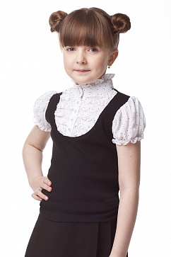 Блузка из трикотажа в рубчик. Кокетка и рукава выполнены из непрозрачного шифона. Кокетка украшена мелкими оборками. Рукав-фонарик.