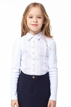 Блузка для девочки из трикотажного полотна в рубчик декорирована белой вставкой из блузочной ткани с настроченным кружевом. Рукава со сборкой в верхней части.