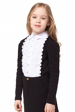 Блузка для девочки из трикотажного полотна в рубчик декорирована белой вставкой из блузочной ткани с настроченным кружевом. Рукава со сборкой в верхней части.